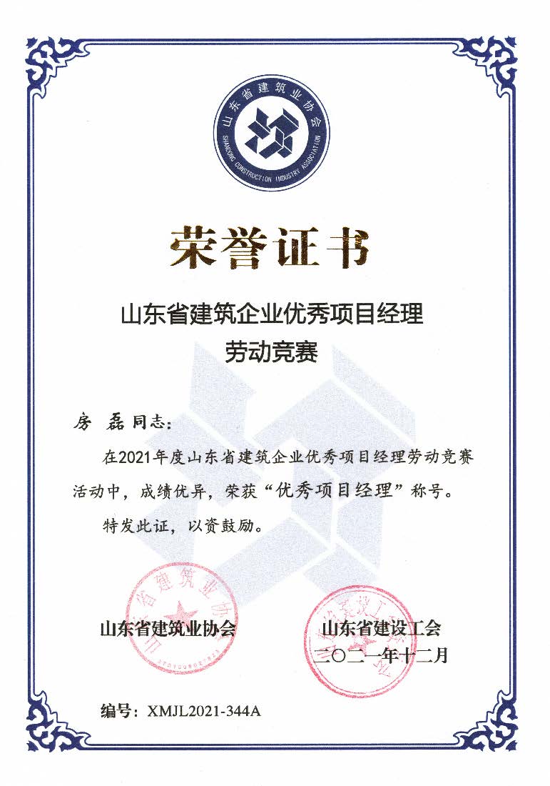 在山东省建筑业协会和山东省建设工会组织的2021年度山东省建筑企业优秀项目经理劳动竞赛活动中,我公司王勇同志和房磊同志获评山东省建筑企业“优秀项目经理”称号。